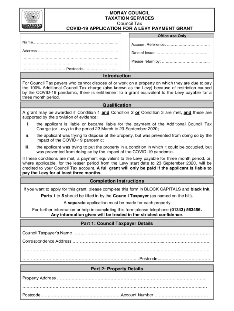 MORAY COUNCIL TAXATION SERVICES Council Tax COVID-19 APPLICATION FOR A LEVY PAYMENT GRANT Office use Only Name... Address... Account Reference: Date of Issue: ....