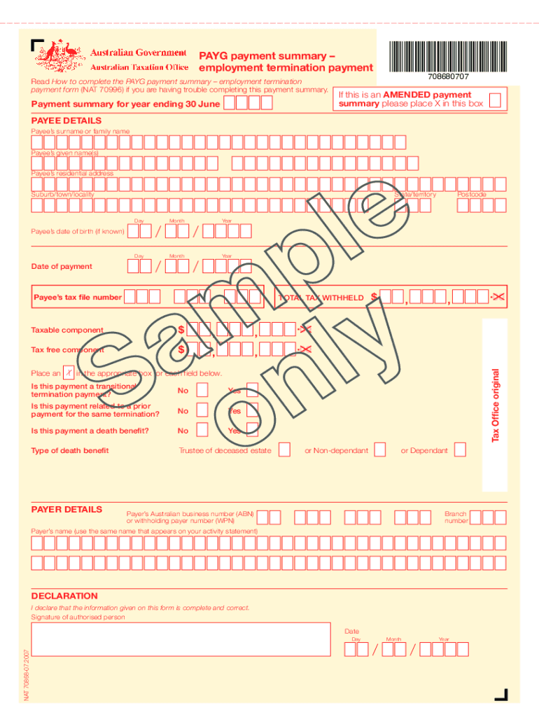 PAY payment summary employment termination payment Read How to complete the PAY payment summary employment termination payment form (NAT 70996) if you are having trouble completing this payment summary.