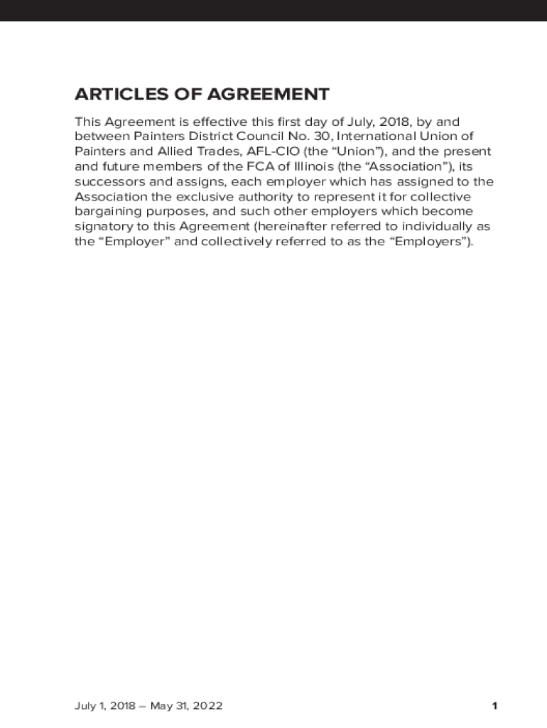 ARTICLES OF AGREEMENT This Agreement is effective this first day of July 2018, by and between Painters District Council No. 30, International Union of Painters and Allied Trades, AFL CIO (the Union),