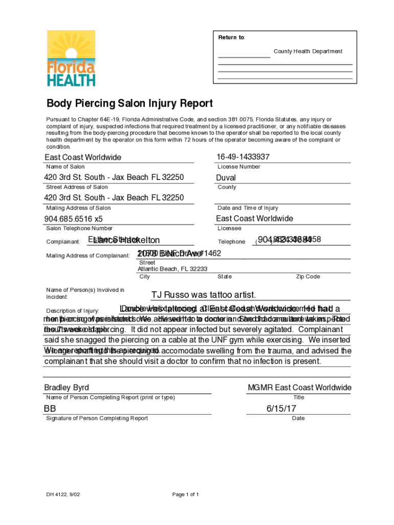 Return to: County Health Departmentally Piercing Salon Injury Report Pursuant to Chapter 64E19, Florida Administrative Code, and section 381.0075, Florida Statutes, any injury or complaint of injury,