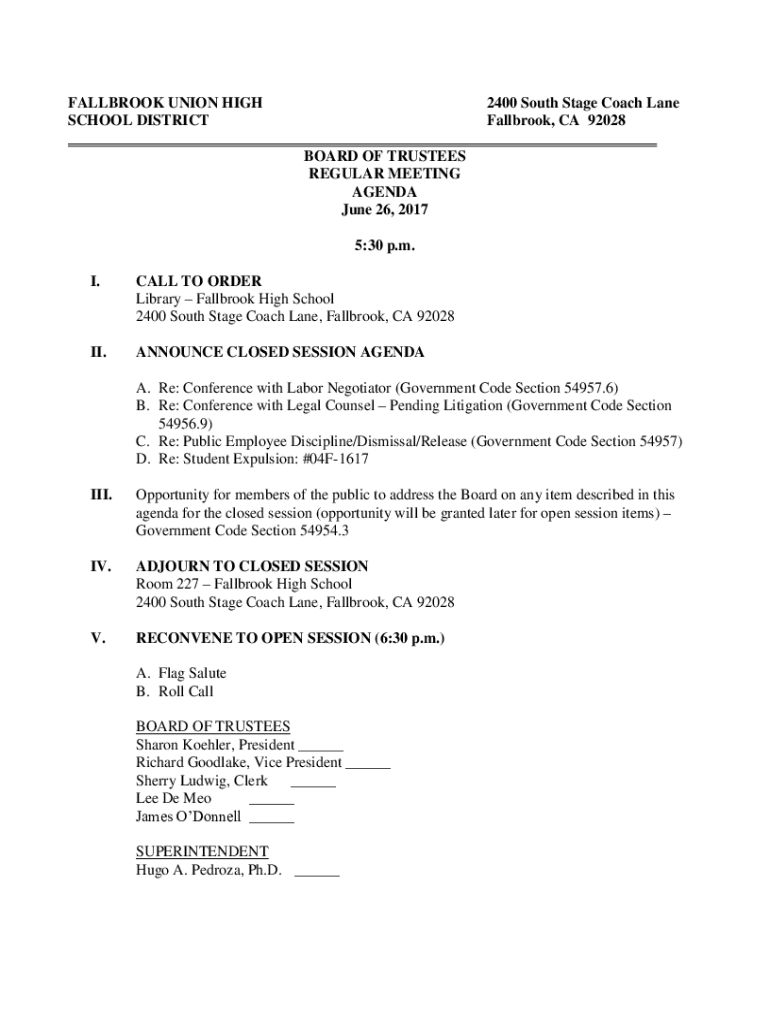 FALLBROOK UNION HIGH SCHOOL DISTRICT2400 South Stage Coach Lane Fallbrook, CA 92028 BOARD OF TRUSTEES REGULAR MEETING AGENDA June 26, 2017 5:30 p.m.I.CALL TO ORDER Library Fallbrook High School 2400