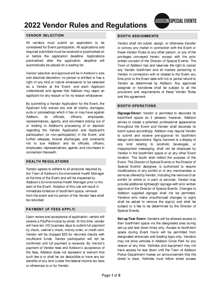2022 Vendor Rules and Regulations VENDOR SELECTIONBOOTH Assignments vendors must submit an application to be considered for Event participation. All applications and required submittals must be received