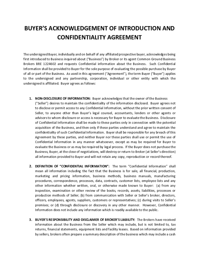 BUYERS ACKNOWLEDGEMENT OF INTRODUCTION AND CONFIDENTIALITY AGREEMENT The undersigned Buyer, individually and on behalf of any affiliated prospective buyer, acknowledges being first introduced to Business
