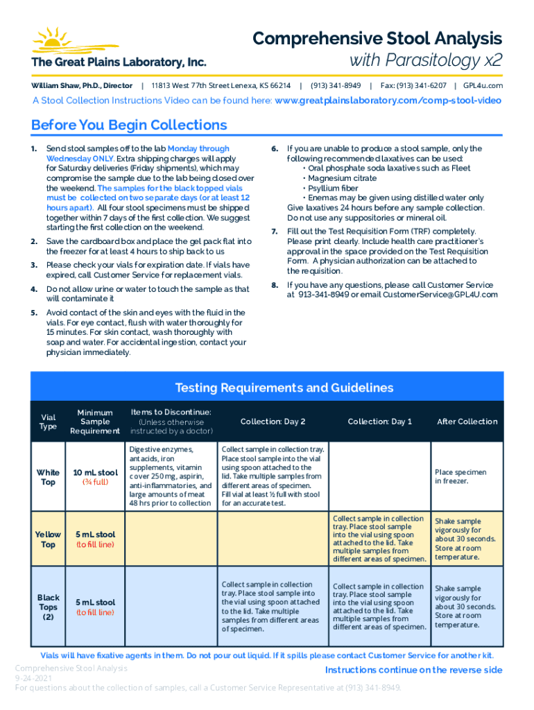 Comprehensive Stool Analysis with Phraseology x2 William Shaw, Ph.D., Director| 11813 West 77th Street Lenexa, KS 66214|(913) 3418949|Fax: (913) 3416207 | GPL4u. Coma Stool Collection Instructions