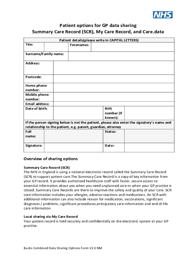 Patient options for GP data sharing Summary Care Record (SCR), My Care Record, and Care. Data Title:Patient details(please write in CAPITAL LETTERS) Forenames:Surname/Family name: Address:Postcode:
