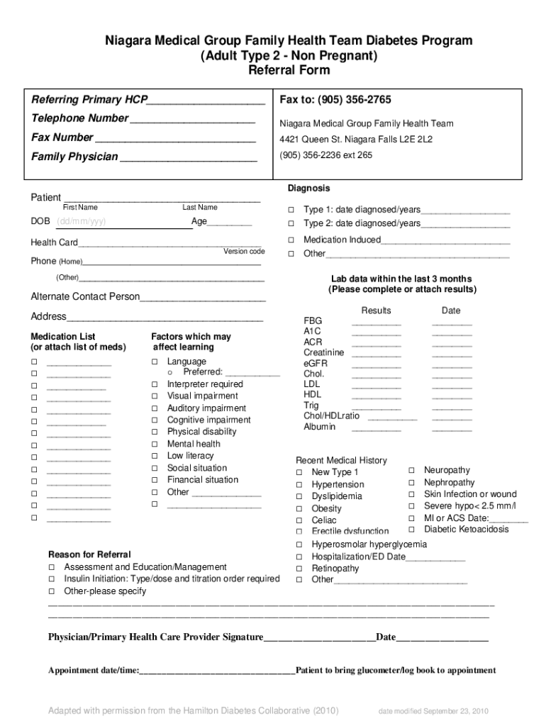 Get the free Niagara North FHT Diabetes Care Team Referral Form