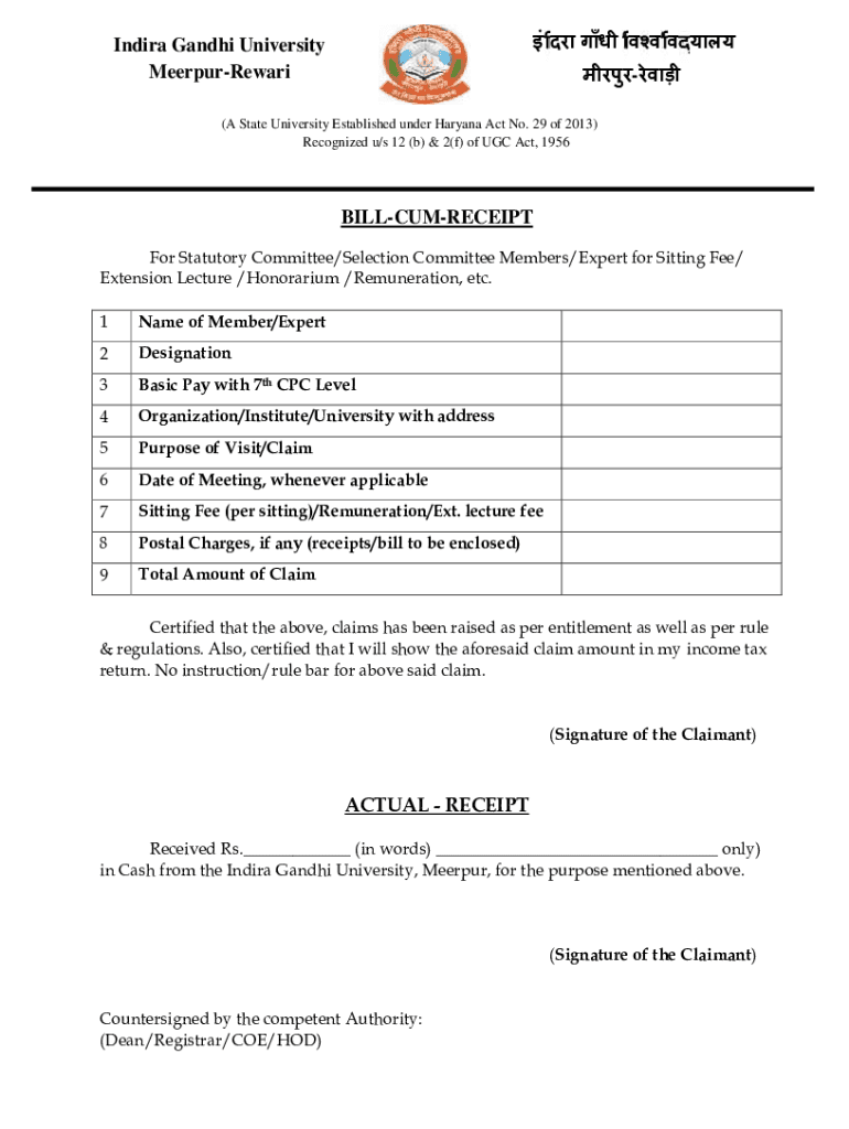 Indira Gandhi University MeerpurRewari (A State University Established under Haryana Act No. 29 of 2013) Recognized u/s 12 (b) & 2(f) of UGC Act, 1956BILLCUMRECEIPT For Statutory Committee/Selection