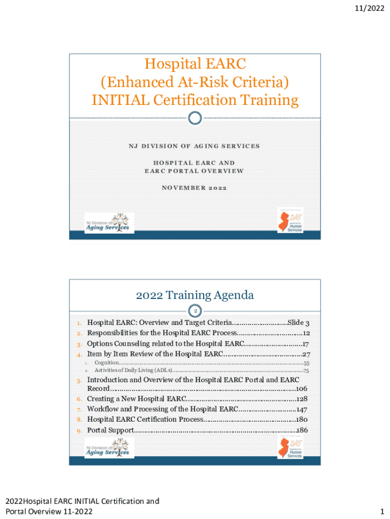 11/2022Hospital EARL (Enhanced Risk Criteria) INITIAL Certification Training NJ DIVISION OF AGING SERVICES HOSPITAL EARL AND EARL PORTAL OVERVIEW NOVEMBER 20222022 Training Agenda 21. Hospital EARL: