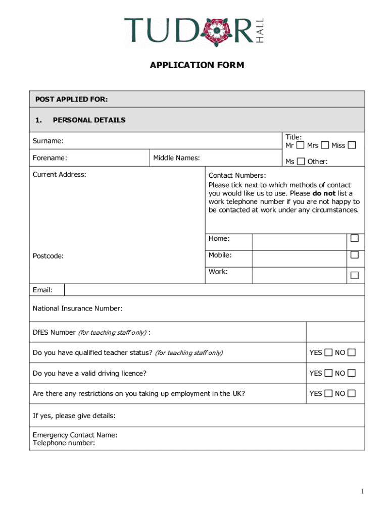 APPLICATION FORM POST APPLIED FOR: 1.PERSONAL DETAILS Title: Mr Surname: Forename: Current Address:Middle Names:MsMissOther:Contact Numbers: Please tick next to which methods of contact you would