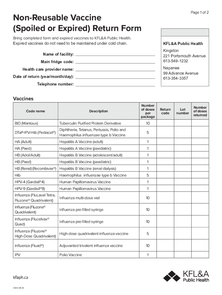 Page 1 of 2NonReusable Vaccine (Spoiled or Expired) Return FormDropoff locationsBring completed form and expired vaccines to FLEA Public Health. Expired vaccines do not need to be maintained under