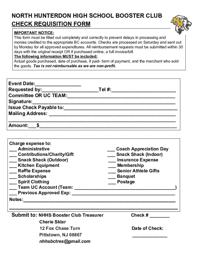NORTH HUNTER DON HIGH SCHOOL BOOSTER CLUB CHECK REQUISITION FORM IMPORTANT NOTICE: This form must be filled out completely and correctly to prevent delays in processing and monies credited to the