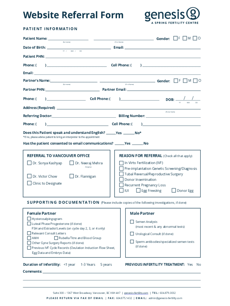 Website Referral Form PATIENT INFORMATION Patient Name: (Surname)Gender:Founder:FMO(First Name)Date of Birth:Email: BY/MM/Patient PhD: Phone: ()Cell Phone: ()Email: Partners Name: (Surname)(First