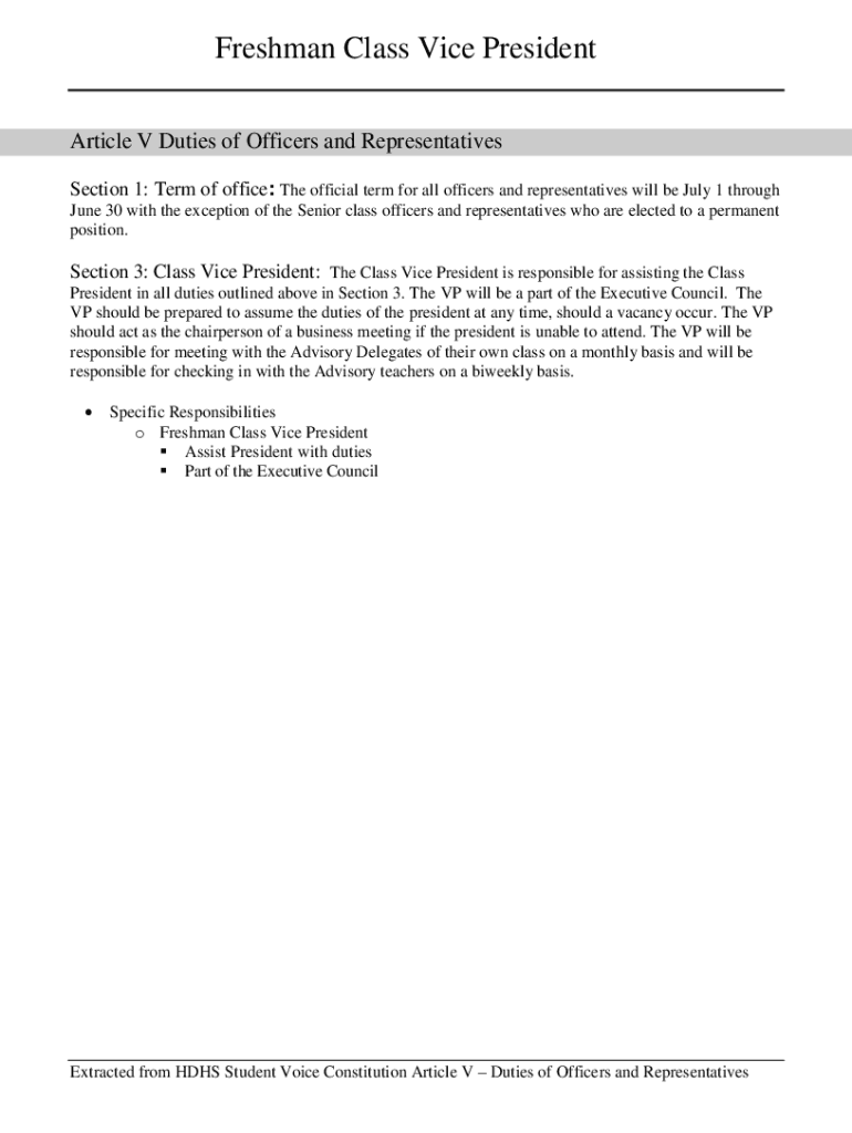 Freshman Class Vice President Nomination Form Article V Duties of Officers and Representatives Section 1: Term of office: The official term for all officers and representatives will be July 1 through