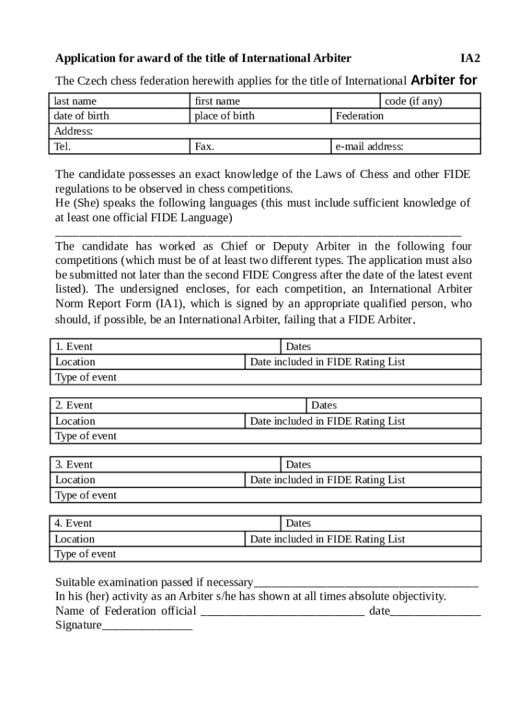 How to fill out Application for award of the title of FIDE Arbiter FA2 The ...
