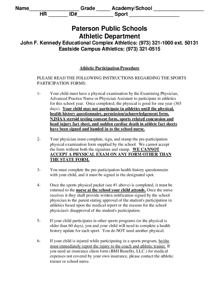 Name___ Grade ___ Academy/School ___ HR ___ ID#___ Sport ___Paterson Public Schools Athletic Department John F. Kennedy Educational Complex Athletics: (973) 3211000 ext. 50131 Eastside Campus Athletics: