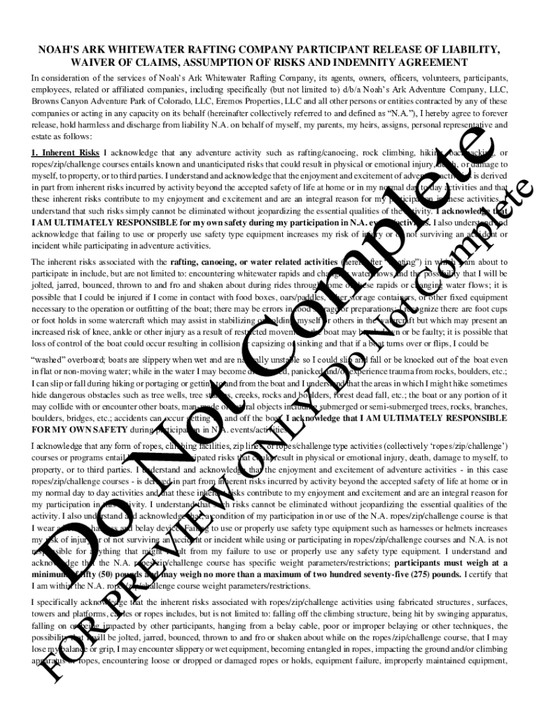 NOAH\'S ARK WHITEWATER RAFTING COMPANY PARTICIPANT RELEASE OF LIABILITY, WAIVER OF CLAIMS, ASSUMPTION OF RISKS AND INDEMNITY AGREEMENT In consideration of the services of Noah's Ark Whitewater Rafting