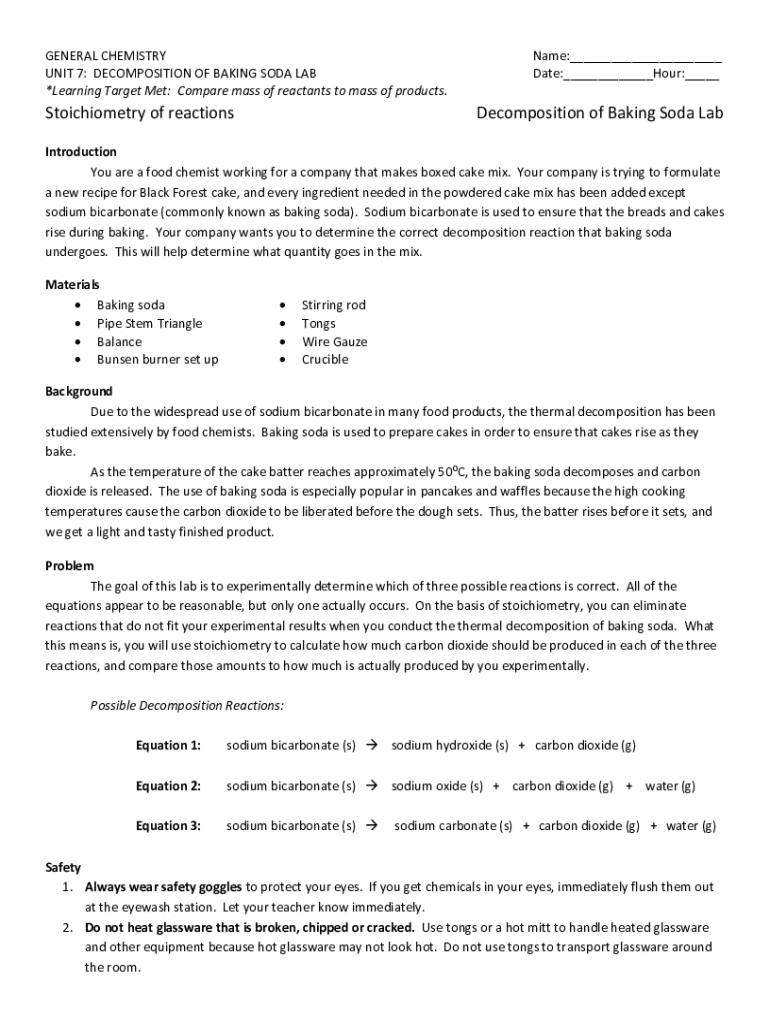 Get the free Stoichiometry of reactions Lab Decomposition of Baking ...