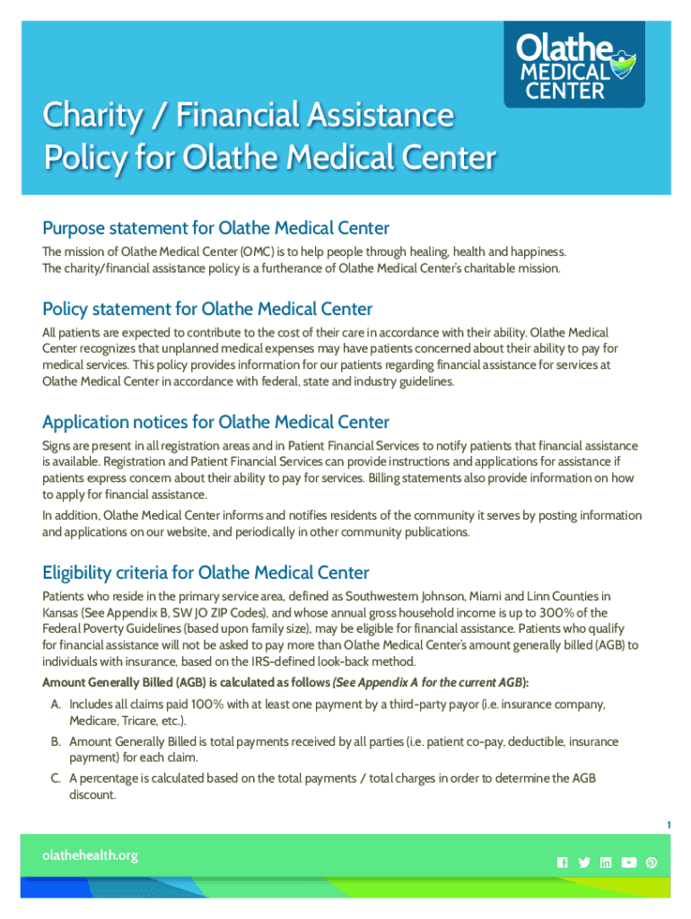 Charity / Financial Assistance Policy for Olathe Medical Center Purpose statement for Olathe Medical Center The mission of Olathe Medical Center (OMC) is to help people through healing, health and