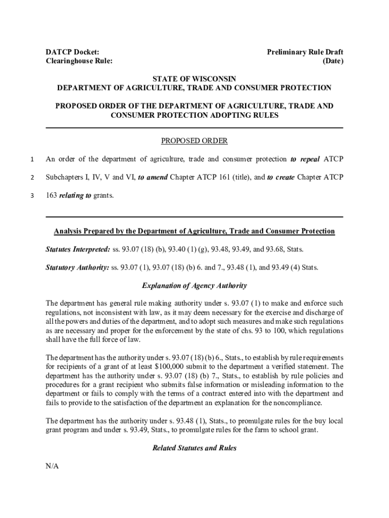 MATCH Docket: Clearinghouse Rule:Preliminary Rule Draft (Date)STATE OF WISCONSIN DEPARTMENT OF AGRICULTURE, TRADE AND CONSUMER PROTECTION PROPOSED ORDER OF THE DEPARTMENT OF AGRICULTURE, TRADE AND