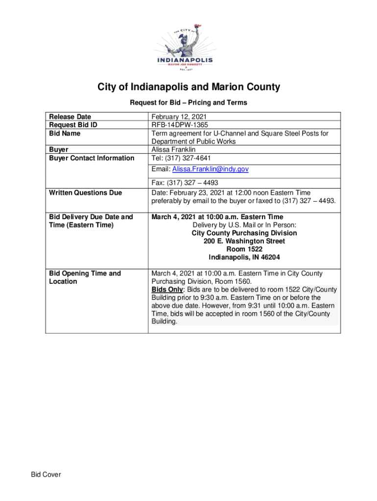 City of Indianapolis and Marion County Request for Bid Pricing and Terms Release Date Request Bid ID Bid Name Buyer Contact Information February 12, 2021 RFB14DPW1365 Term agreement for Channel and