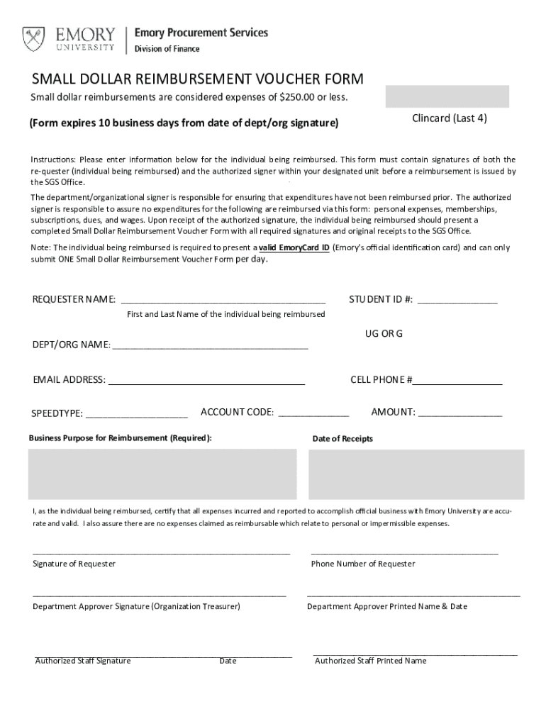 SMALLDOLLARREIMBURSEMENTVOUCHERFORM Smalldollarreimbursementsareconsideredexpensesof$250.00orless. Clinched (Last 4)(Form expires 10 business days from date of dept/org signature)Instruct ONS: Please