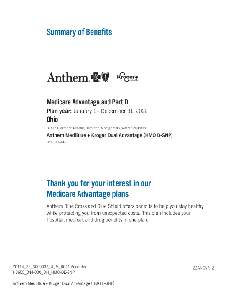 Summary of Benefits Medicare Advantage and Part D Plan year: January 1 December 31, 2022Ohio Butler, Clermont, Greene, Hamilton, Montgomery, Warren countiesAnthem Edible + Kroger Dual Advantage (HMO