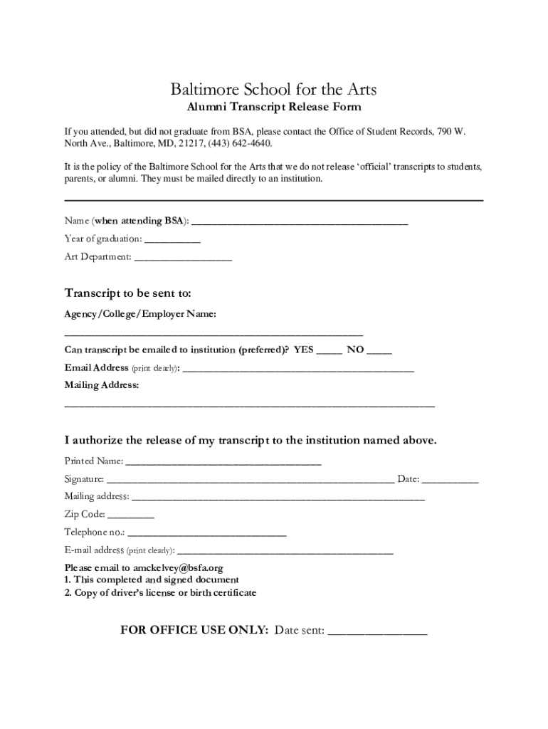Baltimore School for the Arts Alumni Transcript Release Formic you attended, but did not graduate from BSA, please contact the Office of Student Records, 790 W. North Ave., Baltimore, MD, 21217, (443)