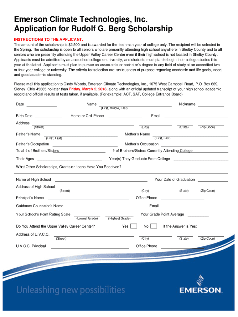 Emerson Climate Technologies, Inc. Application for Rudolf G. Berg Scholarship INSTRUCTIONS TO THE APPLICANT: The amount of the scholarship is $2,500 and is awarded for the freshman year of college