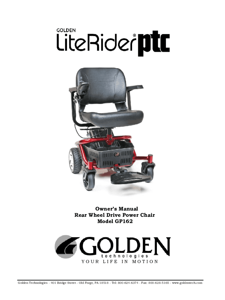 Owners Manual Rear-Wheel Drive Power Chair Model GP162YOUR LIFE IN MOTION Golden Technologies 401 Bridge Street Old Forge, PA 18518 Tel: 8006246374 Fax: 8006285165 www.goldentech.comLiteRider PTC_GP162_Owners