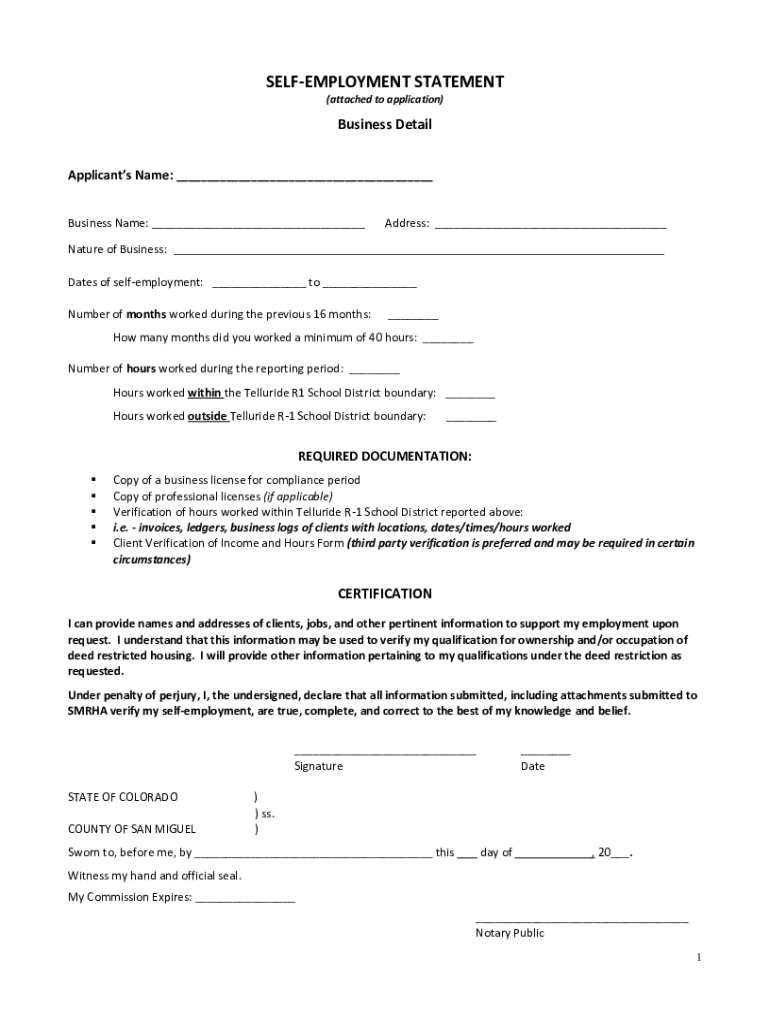 REEMPLOYMENT STATEMENT (attached to application)Business Detail Applicants Name: ___ Business Name: ___ Nature of Business:Address: ______Dates of self-employment: ___ to ___ Number of months worked