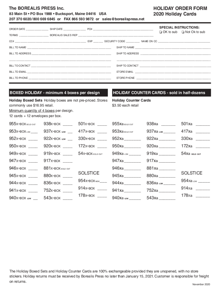 HOLIDAY ORDER FORM 2020 Holiday Cards BOREAL IS PRESS Inc. 83 Main St PO Box 1988 Buck sport, Maine 04416 USA 207 370 6020/800 669 6845 or FAX 866 593 9872 or sales@borealispress.net ORDER DATE ___