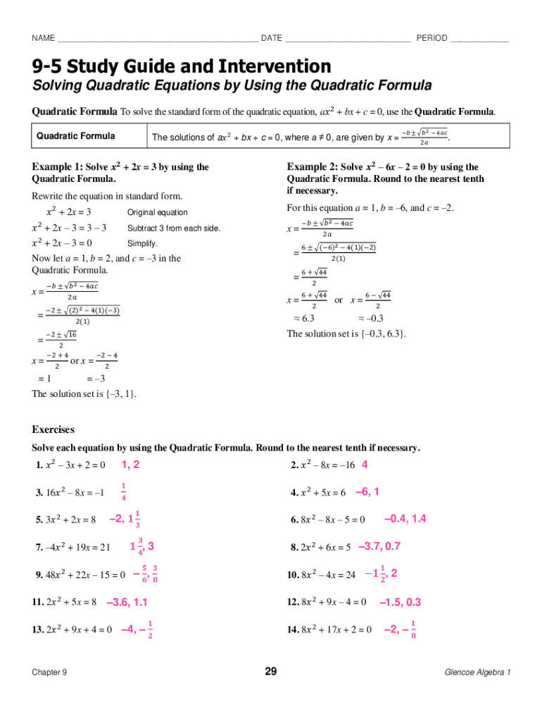 NAME ___ DATE ___ PERIOD ___95 Study Guide and Intervention Solving Quadratic Equations by Using the Quadratic Formula To solve the standard form of the quadratic equation, a 2 + bx + c 0, use the