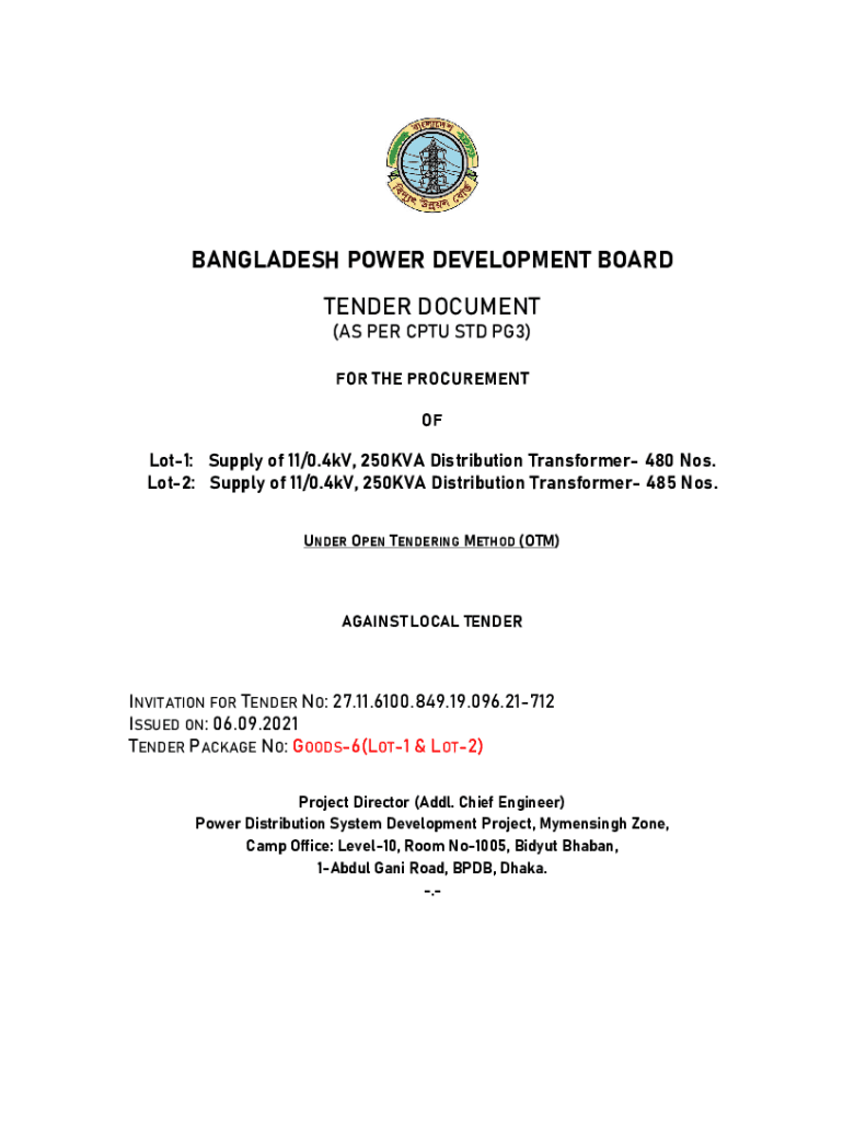 BANGLADESH POWER DEVELOPMENT BOARD TENDER DOCUMENT (AS PER CPU STD PG3) FOR THE PROCUREMENT OFLot1: Supply of 11/0.4kV, 250KVA Distribution Transformer 480 Nos. Lot2: Supply of 11/0.4kV, 250KVA Distribution