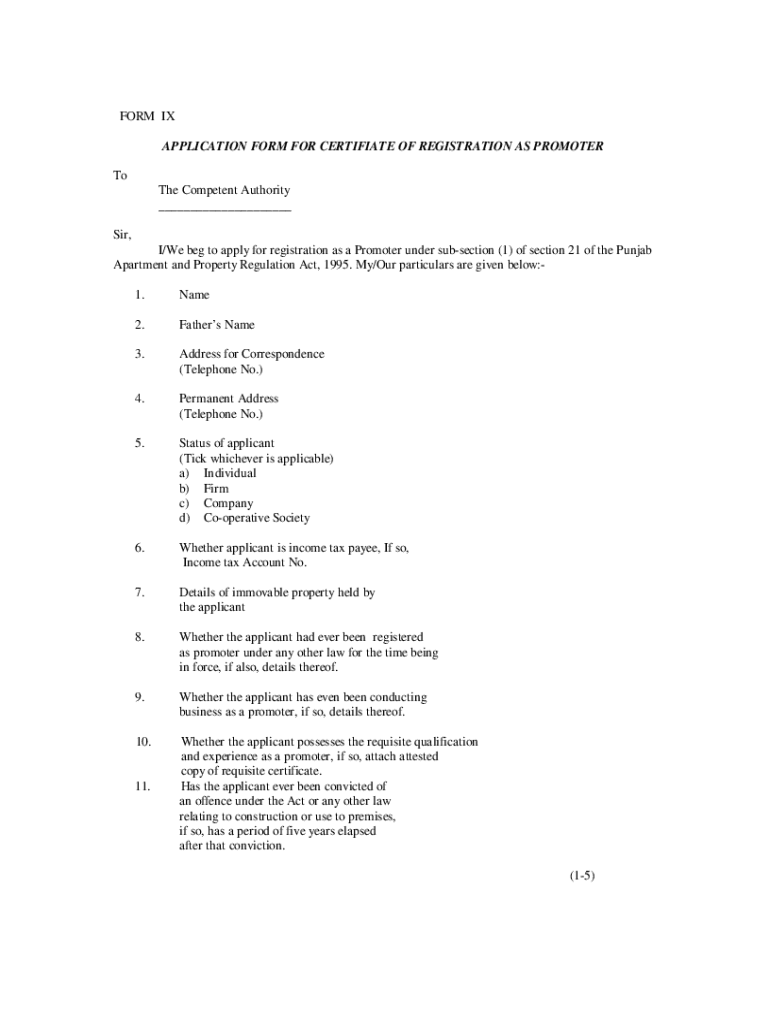 FORM IX APPLICATION FORM FOR CERTIFICATE OF REGISTRATION AS PROMOTER To The Competent Authority ___ Sir, I/We beg to apply for registration as a Promoter under subsection (1) of section 21 of the