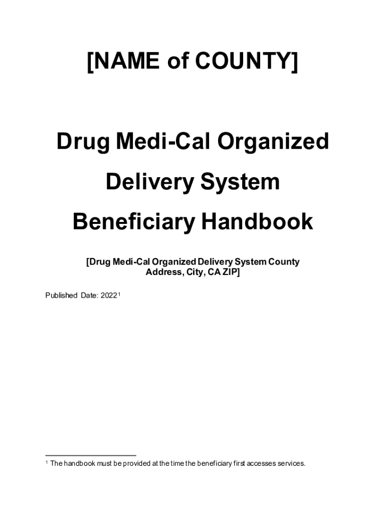 [NAME of COUNTY] Drug Medical Organized Delivery System Beneficiary Handbook [Drug Medical Organized Delivery System County Address, City, CA ZIP] Published Date: 2022 11The handbook must be provided