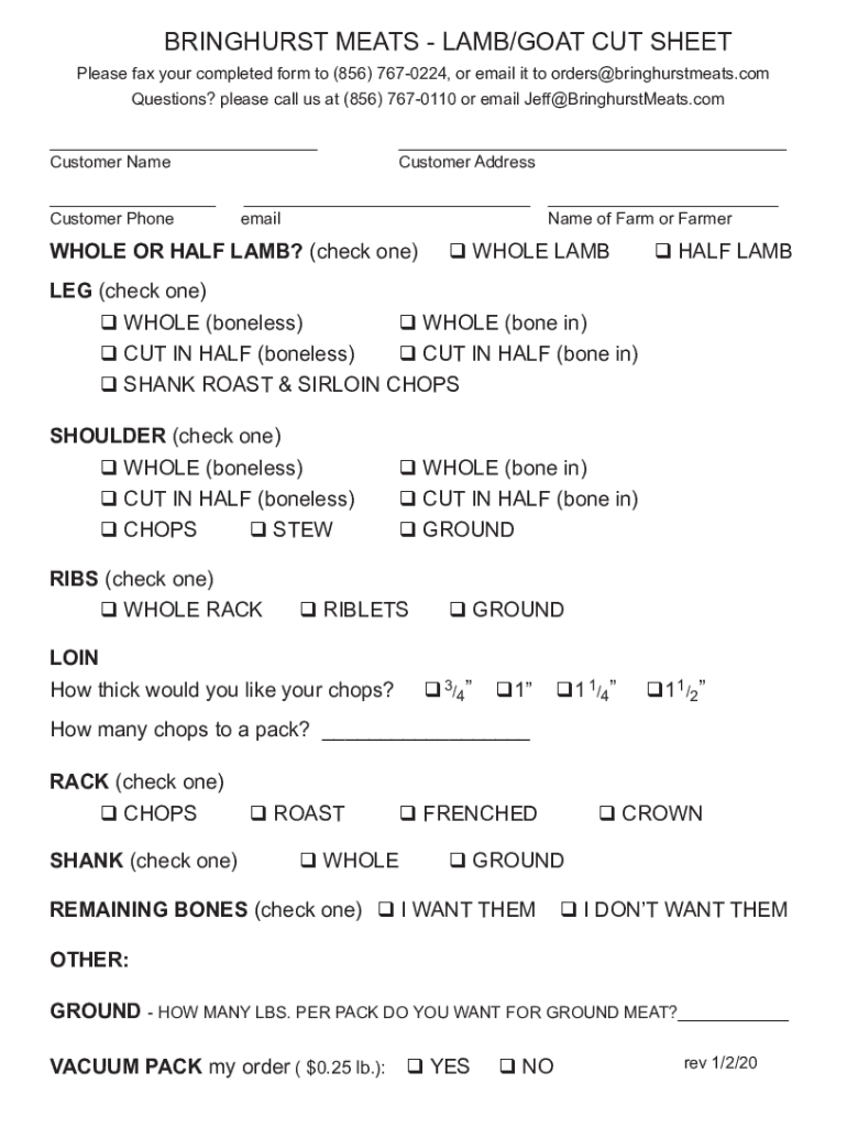 The BRIGHTEST MEATS LAMB/GOAT CUT SHEET Please fax your completed form to (856) 7670224, or email it to orders@bringhurstmeats.com Questions? Please call us at (856) 7670110 or email Jeff@BringhurstMeats.com______