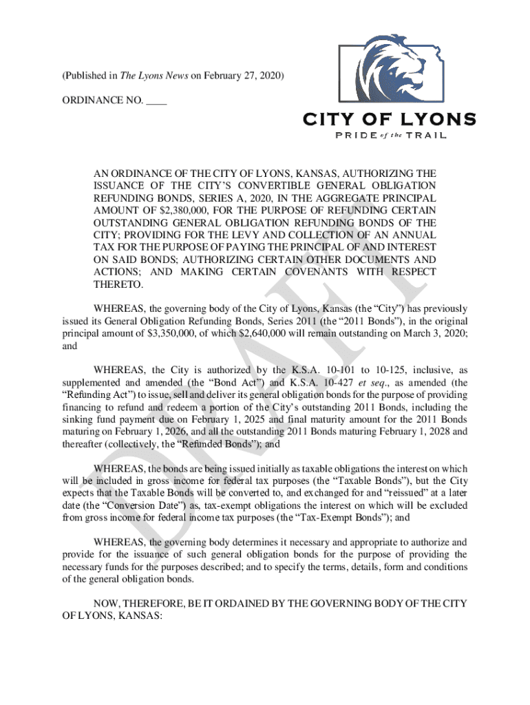 (Published in The Lyons News on February 27, 2020) ORDINANCE NO. ___AN ORDINANCE OF THE CITY OF LYONS, KANSAS, AUTHORIZING THE ISSUANCE OF THE CITY CONVERTIBLE GENERAL OBLIGATION REFUNDING BONDS,