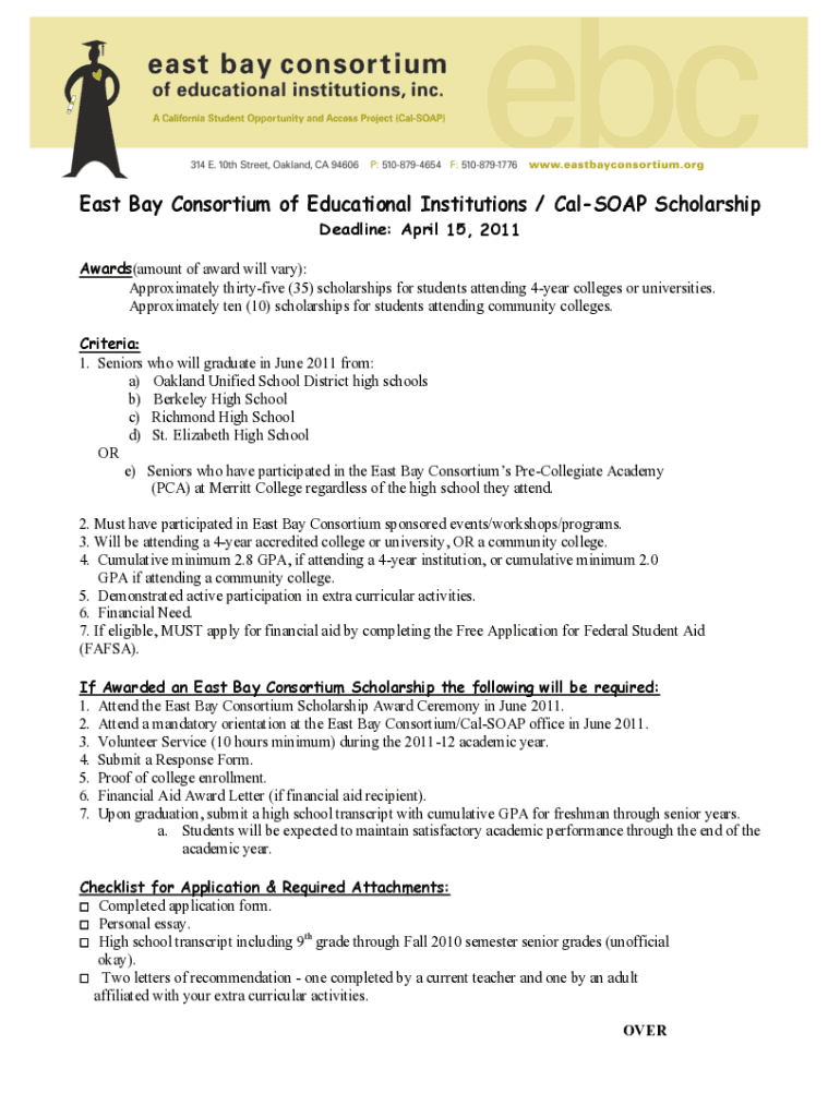 East Bay Consortium of Educational Institutions / Cal SOAP Scholarship Deadline: April 15, 2011Awards(amount of award will vary): Approximately thirty-five (35) scholarships for students attending