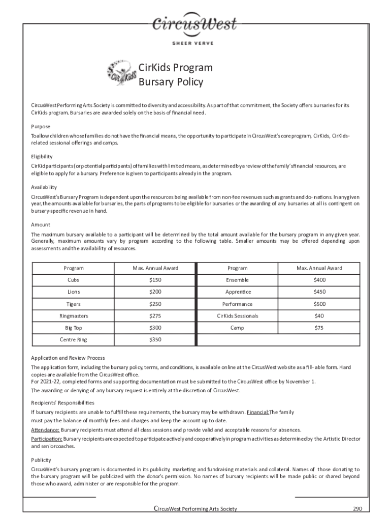 Circus West Performing Arts Society is commi9ed to diversity and accessibility. As part of that commitment, the Society goers bursaries for its