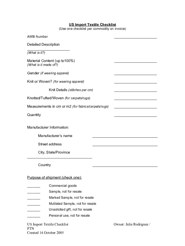 Fill out your us import textile checklist online with pdfFiller!