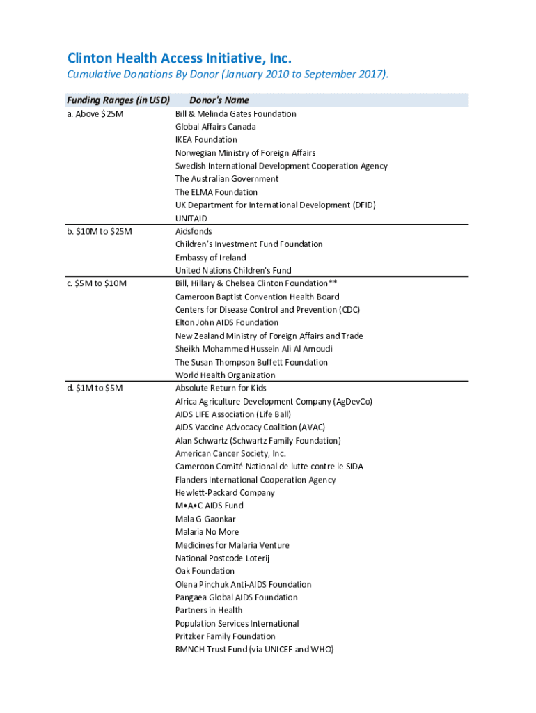 Clinton Health Access Initiative, Inc. Cumulative Donations By Donor (January 2010 to September 2017). Funding Ranges (in USD) a. Above $25Mb. $10M to $25Mc. $5M to $10Md. $1M to $5MDonor\'s Name