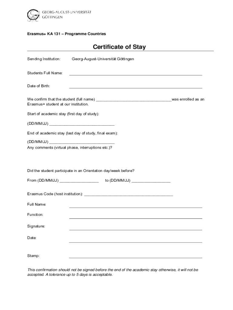Erasmus+ A 131 Program CountriesCertificate of Stay Sending Institution:GeorgAugustUniversitt GttingenStudents Full Name: Date of Birth: We confirm that the student (full name) ___was enrolled as