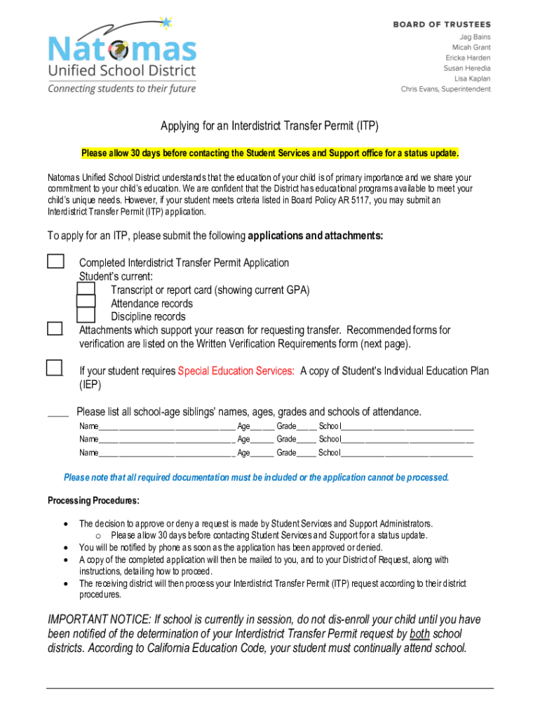 Applying for an Interdistrict Transfer Permit (ITP) Please allow 30 days before contacting the Student Services and Support office for a status update. Atoms Unified School District understands that