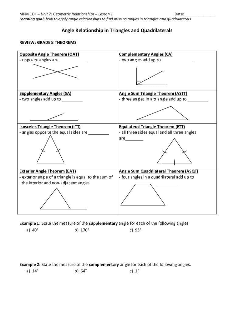 MPM1DIUnit7:GeometricRelationshipsLesson1Date:___ Learning goal:howtoapplyanglerelationshipstofindmissinganglesintrianglesandquadrilaterals. AngleRelationshipinTrianglesandQuadrilaterals REVIEW:GRADE8THEOREMS