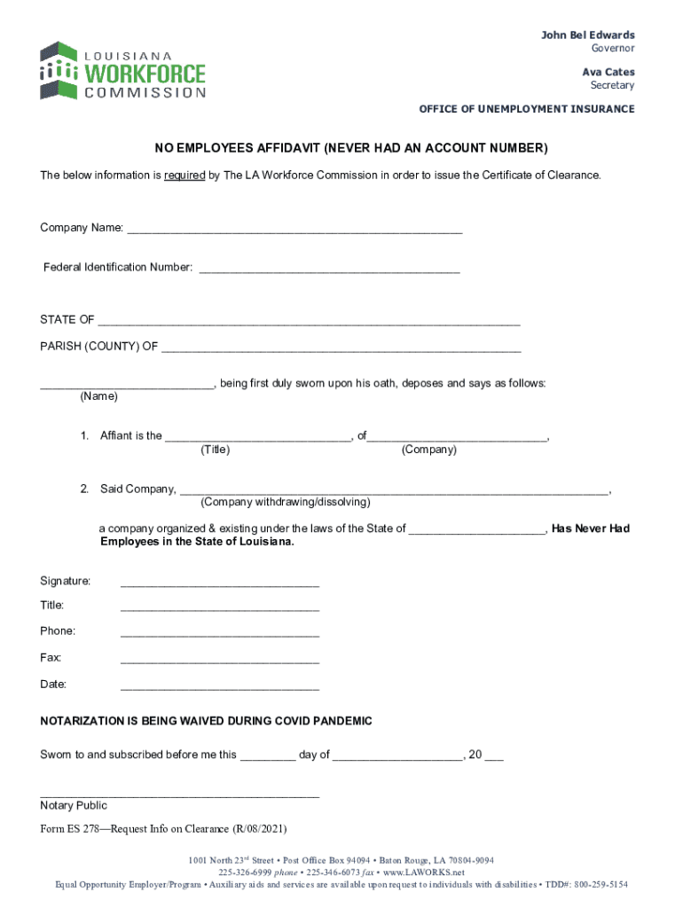 John Bel Edwards Governor Ava Cases Secretary OFFICE OF UNEMPLOYMENT INSURANCE NO EMPLOYEES AFFIDAVIT (NEVER HAD AN ACCOUNT NUMBER) The below information is required by The LA Workforce Commission