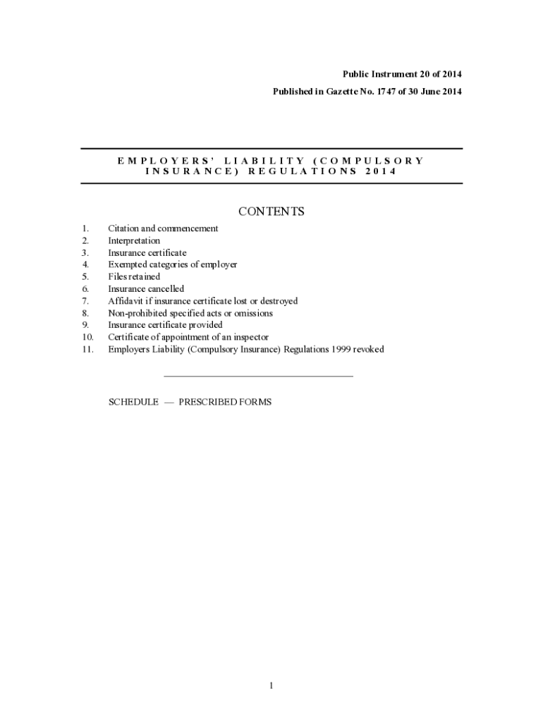 Public Instrument 20 of 2014 Published in Gazette No. 1747 of 30 June 2014EMPLOYERS LIABILITY (COMPULSORY INSURANCE) REGULATIONS 2014CONTENTS 1. 2. 3. 4. 5. 6. 7. 8. 9. 10. 11. Citation and commencement