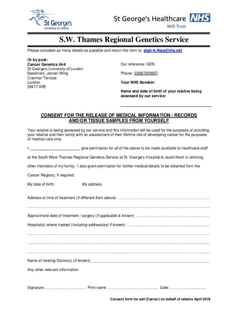 S.W. Thames Regional Genetics Service Please complete as many details as possible and return this form to: stghtr.fhqs@nhs.net Or by post: Cancer Genetics Unit St Georges University of London Basement,