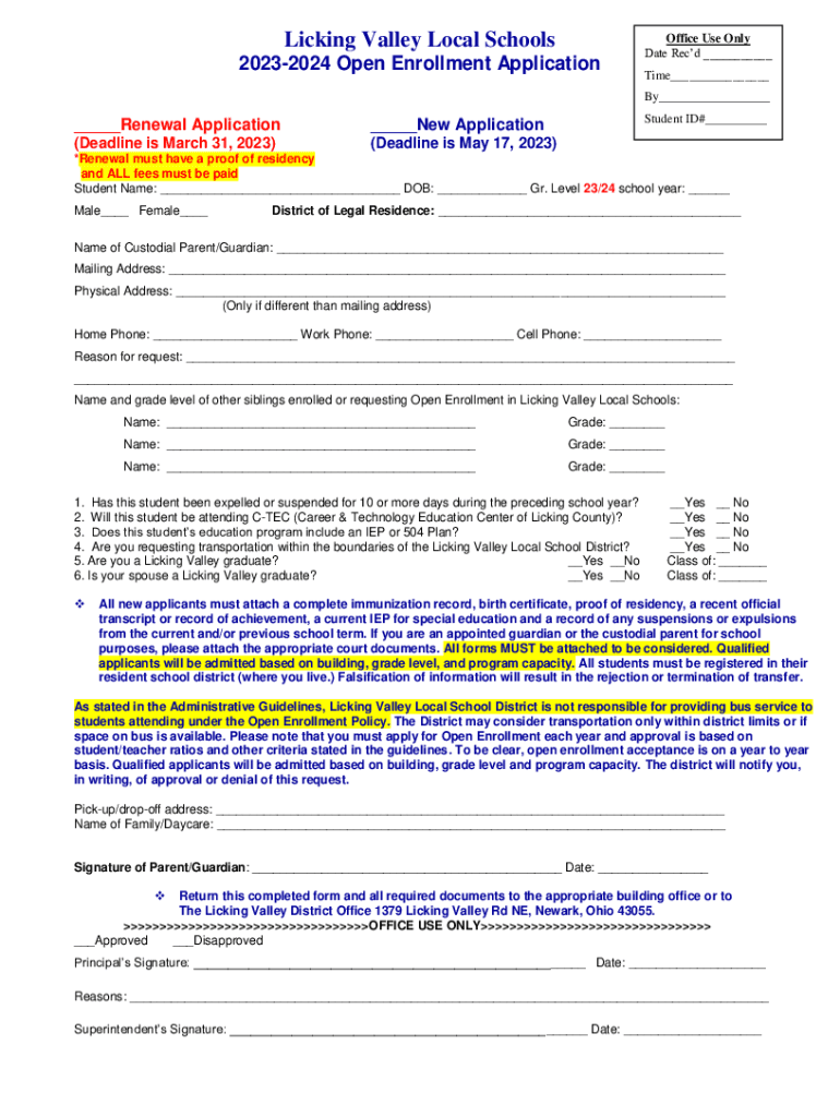 Licking Valley Local Schools 20232024 Open Enrollment ApplicationOffice Use Only Date Recd ___ Time___ By______Renewal Application___New Application(Deadline is March 31, 2023)(Deadline is May 17,