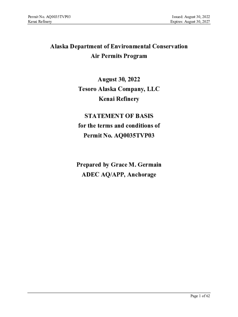 Permit No. AQ0035TVP03 Kenji RefineryIssued: August 30, 2022, Expires: August 30, 2027Alaska Department of Environmental Conservation Air Permits Program August 30, 2022, Resort Alaska Company, LLC