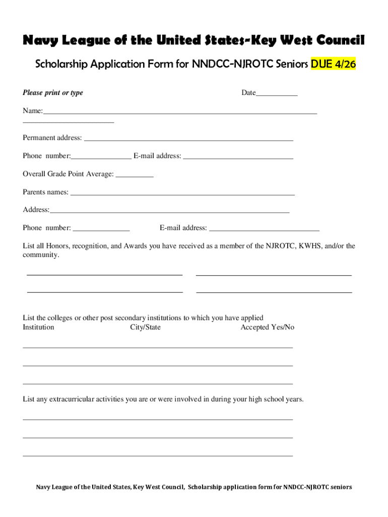 Navy League of the United States Key West Council Scholarship Application Form for NNDCCNJROTC Seniors DUE 4/26 Please print or typeDate___Name:___ ___ Permanent address: ___ Phone number:___ Email